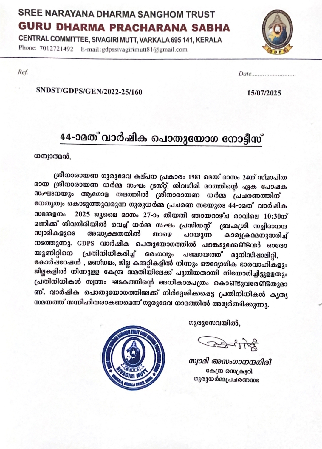 <p>ധന്യാത്മൻ,</p><p><br></p><p>ശ്രീനാരായണ ഗുരുദേവ കല്പന പ്രകാരം 1981 മെയ് മാസം 24ന് സ്ഥാപിത മായ ശ്രീനാരായണ ധർമ്മ സംഘം ട്രസ്റ്റ്, ശിവഗിരി മഠത്തിൻ്റെ ഏക പോഷക സംഘടനയും ആഗോള തലത്തിൽ ശ്രീനാരായണ ധർമ്മ പ്രചരണത്തിന് നേത്യത്വം കൊടുത്തുവരുന്ന ഗുരുധർമ്മ പ്രചരണ സഭയുടെ 44-ാമത് വാർഷിക സമ്മേളനം 2025 ജൂലൈ മാസം 27-ാം തീയതി ഞായറാഴ്ച രാവിലെ 10:30ന് മണിക്ക് ശിവഗിരിയിൽ വെച്ച് ധർമ്മ സംഘം പ്രസിഡൻ്റ് ബ്രഹ്മശ്രീ സച്ചിദാനന്ദ സ്വാമികളുടെ അദ്ധ്യക്ഷതയിൽ താഴെ പറയുന്ന കാര്യക്രമമനുസരിച്ച് നടത്തുന്നു. GDPS വാർഷിക പെതുയോഗത്തിൽ പങ്കെടുക്കേണ്ടവർ ഓരോ യൂണിറ്റിനെ പ്രതിനിധീകരിച്ച് ഒരംഗവും പഞ്ചായത്ത് മുനിസിപ്പാലിറ്റി, കോർപ്പറേഷൻ, മണ്ഡലം, ജില്ല കമ്മറ്റികളിൽ നിന്നും ഔദ്യോഗിക ഭാരവാഹികളും ജില്ലകളിൽ നിന്നുളള കേന്ദ്ര സമതിയിലേക്ക് പുതിയതായി നിയോഗിച്ചിട്ടുളളതും പ്രതിനിധികൾ സ്വന്തം ഘടകത്തിൻ്റെ അധികാരപത്രം കൊണ്ടുവരേണ്ടതുമാ ണ്. വാർഷിക പൊതുയോഗത്തിലേക്ക് നിർദ്ദേശിക്കപ്പെട്ട പ്രതിനിധികൾ കൃത്യ സമയത്ത് സന്നിഹിതരാകണമെന്ന് ഗുരുദേവ നാമത്തിൽ അഭ്യർത്ഥിക്കുന്നു.</p>