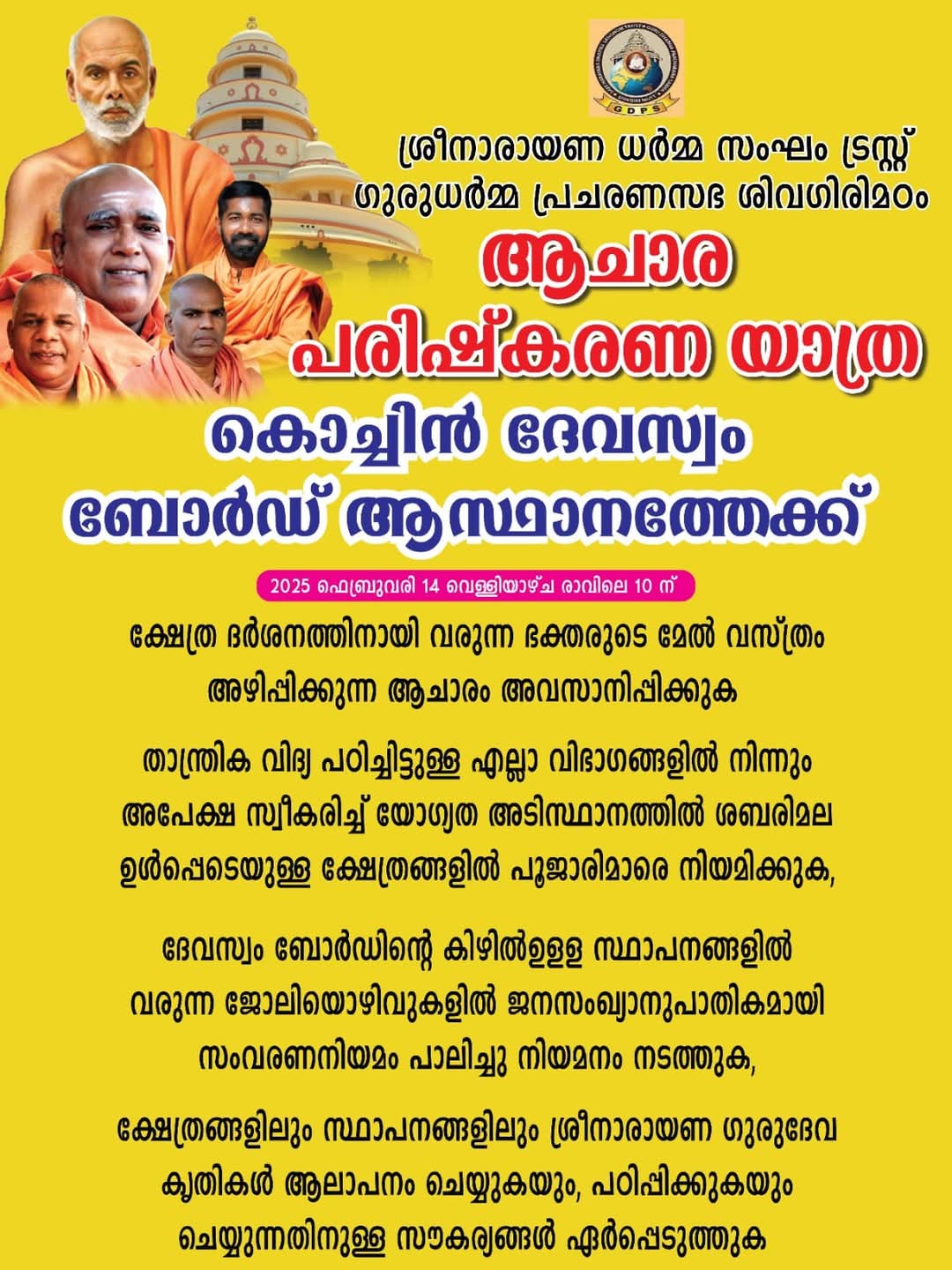 <p>ശ്രീനാരായണ ധർമ്മ സംഘം ട്രസ്റ്റ് .. ഗുരുധർമ്മ പ്രചരണസഭ ശിവഗിരിമഠം</p><p><br></p><p>ആചാര പരിഷ്കരണ യാത്ര</p><p><br></p><p>കൊച്ചിൻ ദേവസ്വം ബോർഡ് ആസ്ഥാനത്തേക്ക്</p><p><br></p><p>2025 ഫെബ്രുവരി 14 വെള്ളിയാഴ്ച രാവിലെ 10 ന്</p><p><br></p><p>ക്ഷേത്ര ദർശനത്തിനായി വരുന്ന ഭക്തരുടെ മേൽ വസ്ത്രം അഴിപ്പിക്കുന്ന ആചാരം അവസാനിപ്പിക്കുക താന്ത്രിക വിദ്യ പഠിച്ചിട്ടുള്ള എല്ലാ വിഭാഗങ്ങളിൽ നിന്നും അപേക്ഷ സ്വീകരിച്ച് യോഗ്യത അടിസ്ഥാനത്തിൽ ശബരിമല ഉൾപ്പെടെയുള്ള ക്ഷേത്രങ്ങളിൽ പൂജാരിമാരെ നിയമിക്കുക,</p><p><br></p><p>ദേവസ്വം ബോർഡിൻ്റെ കിഴിൽഉള്ള സ്ഥാപനങ്ങളിൽ വരുന്ന ജോലിയൊഴിവുകളിൽ ജനസംഖ്യാനുപാതികമായി സംവരണനിയമം പാലിച്ചു നിയമനം നടത്തുക,</p><p><br></p><p>ക്ഷേത്രങ്ങളിലും സ്ഥാപനങ്ങളിലും ശ്രീനാരായണ ഗുരുദേവ കൃതികൾ ആലാപനം ചെയ്യുകയും, പഠിപ്പിക്കുകയും ചെയ്യുന്നതിനുള്ള സൗകര്യങ്ങൾ ഏർപ്പെടുത്തുക</p>