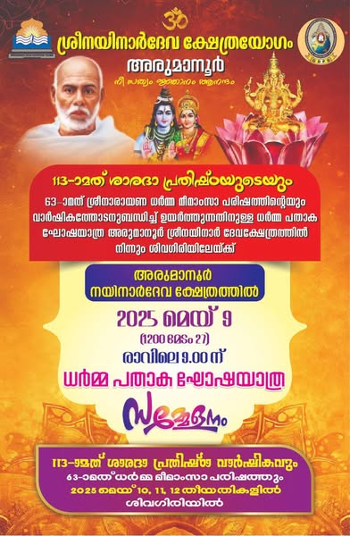 <p>ധർമ്മപതാക ഘോഷയാത്ര മെയ് 9ന് അരുമാനൂര് ശ്രീനയിനാര്ദേവക്ഷേത്രത്തില് നിന്നും തുടങ്ങി ശിവഗിരിയിലേക്ക് എത്തിചേരും</p>